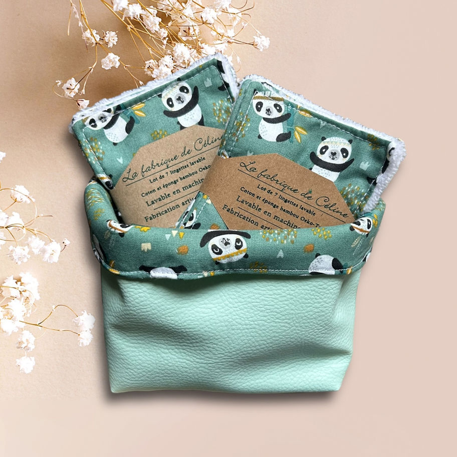 Lot 14 lingettes verte avec pandas + corbeille simili vert d’eau